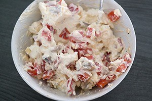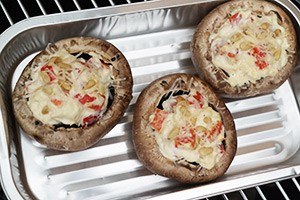 2. Meng het paprikamengsel door de roomkaas en vul de portobello’s hiermee. Bestrooi met wat pijnboompitten en wat geraspte Parmezaanse kaas. Leg ze op een stuk aluminiumfolie of in een aluminium bakje op de BBQ of doe ze in een ovenschaal in de oven op 200 graden.