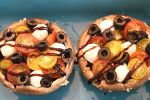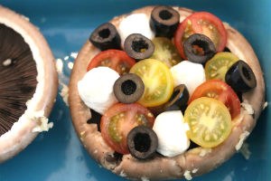 1. Verwarm de oven op 200 graden. Meng geperste knoflook en 2 eetlepels zonnebloemolie. Vet hiermee de onderkant en randjes van de portobello’s in. Halveer de cherrytomaatjes en zwarte olijven. Vul de portobello’s nu elk met 4 mini mozzarella bolletjes, 4 gehalveerde cherrytomaatjes en 4 gehalveerde zwarte olijven.
