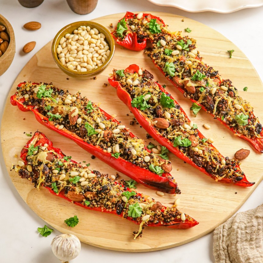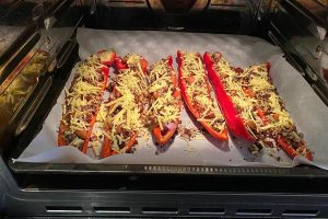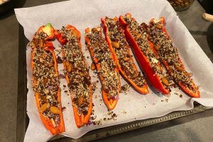 7. Leg de paprika’s op een bakplaat en vul ze met de quinoa mix. Verdeel er vervolgens wat vegan geraspte kaas overheen en zet de bakplaat vervolgens in de oven. Bak de paprika’s zo’n 25 minuten.