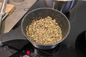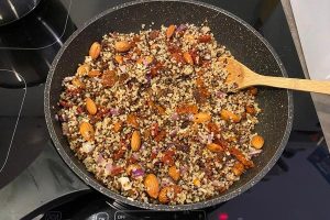 6. Doe de gekookte quinoa in de pan en roer nogmaals goed door.