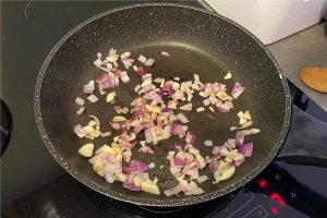 4. Zet een koekenpan op het vuur en bak hierin de ui en knoflook in wat olijfolie. Voeg de Italiaanse kruiden, peper en zout toe en bak dit eventjes mee. Voeg een scheut water toe om aanbranden te voorkomen.