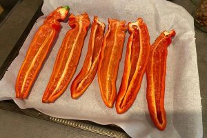 2. Snijd de puntpaprika’s in de lengte doormidden en verwijder de zaadjes.