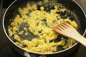 8. De eieren hoeven maar kort gebakken te worden. Na circa 4 minuten moet het mengsel smeuïg zijn.