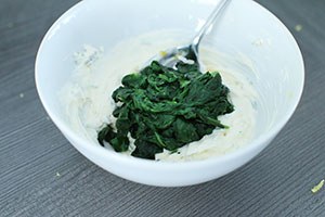 1. Verwarm de oven op 200 graden. Roerbak de spinazie met een snufje peper en zout tot deze geslonken is. Laat uitlekken in een zeef of vergiet en druk zo veel mogelijk vocht er uit. Hak de bieslook fijn en pers het teentje knoflook uit en roer samen met de citroenrasp door de crème fraiche.
