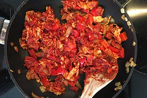 2. Snipper de ui en snijd de knoflook fijn. Bak eventjes in een pan en voeg de pulled chicken, tomatenpuree, chilipoeder, peper en zout toe. Snijd de paprika in kleine stukjes en voeg deze ook toe aan de pan. Bak 5 minuutjes.