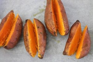 1. Verwarm de oven op 200 graden. Was de zoete aardappels goed en dep ze droog (met schil). Doe ze in een kom en voeg 1 eetlepel olie, peper en zout toe en meng door elkaar. Prik er met een prikker of vork gaatjes in. Leg ze op een bakplaat met bakpapier en pof ze 45 minuten in de oven, draai halverwege om.