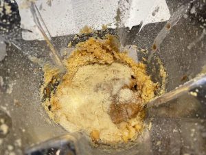 2. Doe de pindakaas, amandelmeel, maple syrup, amandelmelk, vanille aroma en zout erbij en mix het tot een massa.