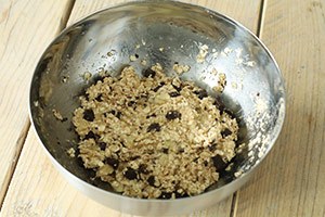 1. Verwarm de oven voor op 180 graden. Hak de chocolade in kleine stukjes. Prak de bananen in een kom fijn met een vork. Roer dan de havermout en de chocolade erdoorheen.