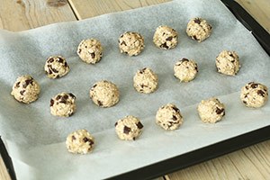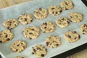 2. Maak 16 balletjes van het mengsel en druk ze plat op de bakplaat. Zet de bakplaat in de oven voor 20 minuten.