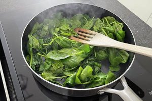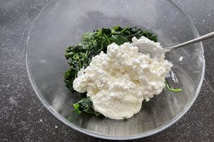 6. Bak in een andere grote pan de spinazie beetje bij beetje tot deze geslonken is. Laat de spinazie goed uitlekken in een vergiet en doe vervolgens in een kom. Schep de Hüttenkäse erdoor en breng het mengsel goed op smaak met peper en zout.