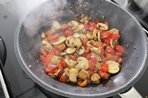 2. Fruit de ui en knoflook aan in een pan met een klein beetje olie of boter. Voeg de champignons toe.
