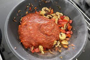 3. Snijd de paprika in kleine blokjes en bak ook mee. Voeg dan de tomatenblokjes toe en breng op smaak met peper, zout en Italiaanse kruiden. Voeg ook wat verse basilicum toe in stukjes.