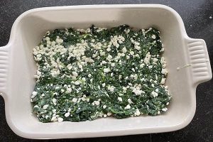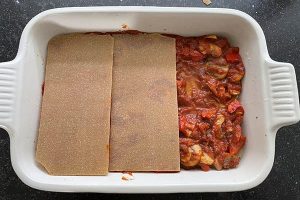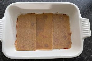 8. Verdeel een klein beetje van de tomatensaus over de bodem. Leg hier 3 lasagnebladen op. Verdeel hier de helft van het spinaziemengsel. Dek af met lasagnebladen. Verdeel hier ongeveer de helft van de tomatensaus over. Dek af met lasagnebladen. Hier gaat de rest van de spinazie overheen. Dek weer af met lasagnevellen en als laatste de tomatensaus.