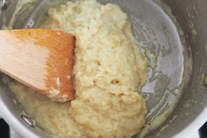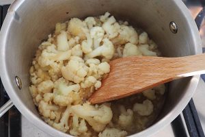 2. Wanneer de bloemkool gaar is, pureer deze tot een glad mengsel. Voeg de melk en 100 gram kaas toe, roer dit goed door tot een gladde saus.