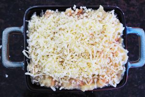 3. Breng op smaak met peper en zout en voeg dan de gekookte pasta toe aan de saus. Roer dit nog een keer goed door en doe daarna het mengsel in een ovenschaal. Bestrooi de pasta met de overige kaas en zet ongeveer voor 10 minuten in de oven, zodat de kaas smelt en wat bruin wordt.