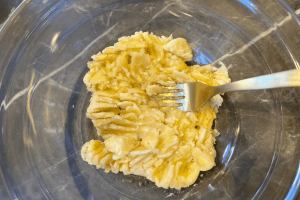 4. Meng de havervlokken en de maple syrup met de geprakte banaan.
