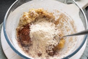 3. Voeg de pindakaas, het meel, cacaopoeder, bakpoeder en eventueel het proteïnepoeder toe.