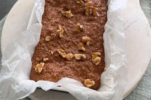 6. Giet het mengsel in een bakvorm bekleed met bakpapier of goed ingevet. Doe er eventueel nog wat extra walnoten bovenop.