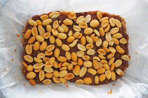 2. Doe 3/4e van het mengsel in een aparte kom en zet apart en laat 1/4e van het mengsel in de keukenmachine zitten. Voeg het havermeel en 2 el water toe aan de keukenmachine en mix dit tot een geheel. Bekleed een bakvorm met bakpapier en verdeel hier het havermeel mengsel over. Verdeel hierna de karamel laag er overheen en strooi de pinda’s over de karamel laag. Duw ze een beetje aan zodat ze goed blijven zitten. Zet deze voor minimaal 2 uur in de koelkast.