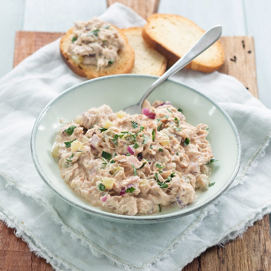 5. Bewaar de tonijnsalade afgesloten in de koelkast. Lekker op brood als lunch of op een cracker als borrelhapje.
