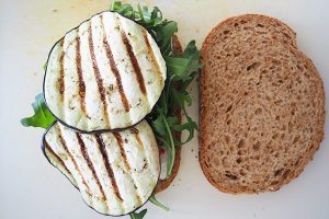 2. Leg de 4 sneetjes brood klaar. Beleg 2 van de sneetjes brood met de mozzarella, zongedroogde tomaatjes, een handje rucola en de gegrilde aubergine. Leg de andere 2 sneetjes er op en druk iets aan.