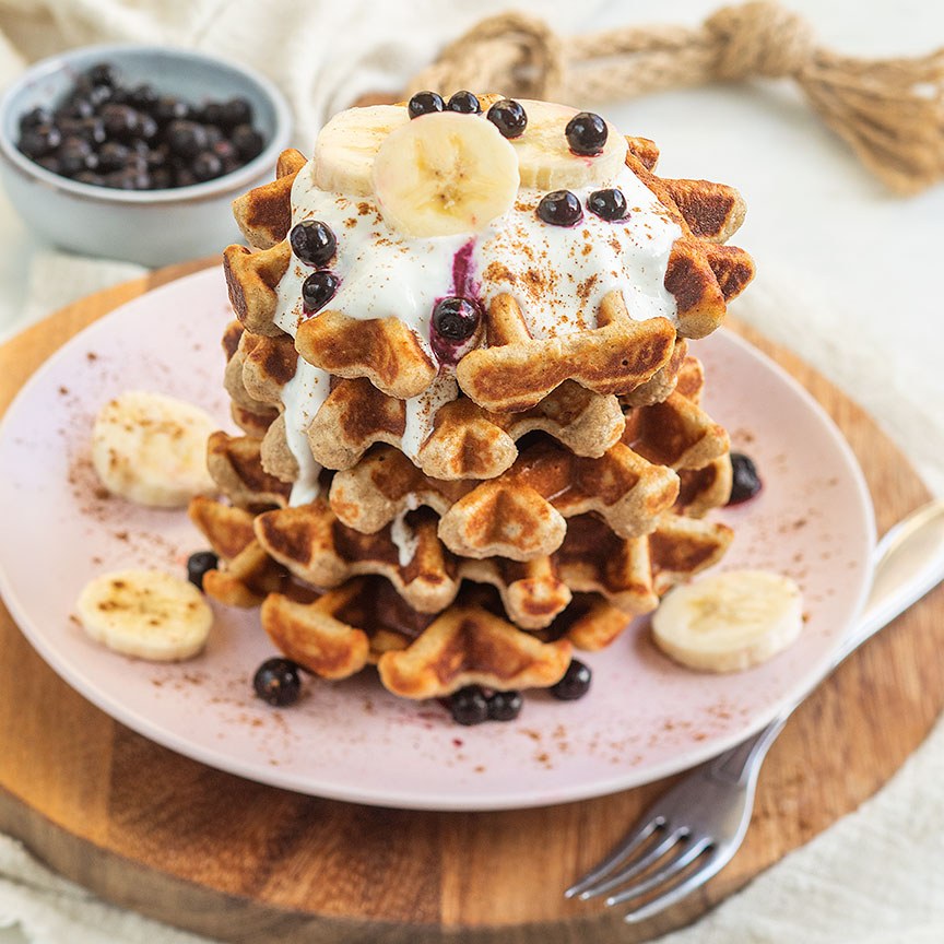 5. Serveer de wafels eventueel met wat extra yoghurt en fruit. Ook lekker met walnoten.