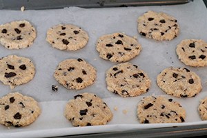 2. Vorm balletjes van het deeg en druk deze plat op de bakplaat. Zet de bakplaat 15 minuten in de oven, totdat de koekjes mooi bruin zijn gekleurd.