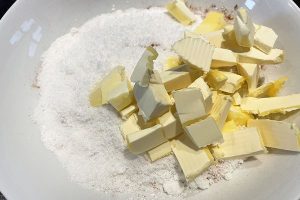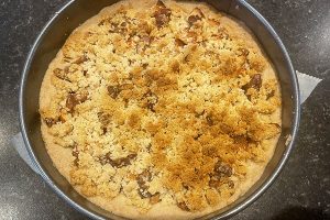 4. Voeg samen maak er met je handen kruimels van. Verdeel dit over het appelmengsel.