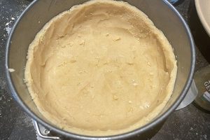 2. Vet de springvorm in en bekleed de bodem met bakpapier. Kneed het deeg nog even door en rol driekwart van het deeg uit. Bekleed hiermee de bodem van de springvorm. Maak het deeg met de bolle kant van een lepeltje egaal.