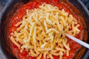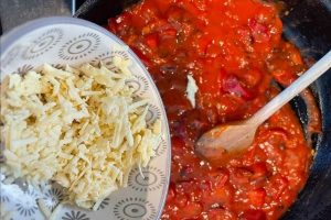 5. Giet dan de tomatensaus erbij en rasp de kaas. Schep door elkaar.