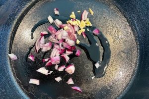 2. Snijd de rode ui en knoflook fijn en fruit met de olijfolie aan in een pan.
