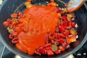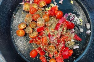 3. Snijd de tomaatjes doormidden en paprika in blokjes. Voeg toe aan de pan samen met de Italiaanse kruiden.