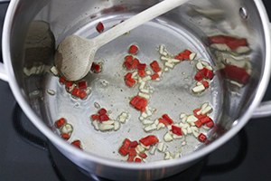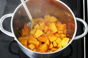 2. Hak de knoflook en de rode peper (naar smaak) fijn. Fruit aan in een pan met een beetje olie of boter. Voeg dan de stukjes pompoen toe en bak nog 2 minuutjes mee.