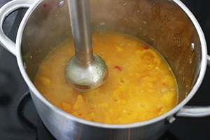 4. Pureer de pompoen dan fijn met de staafmixer. Breng de saus op smaak met een snufje gedroogde salie.