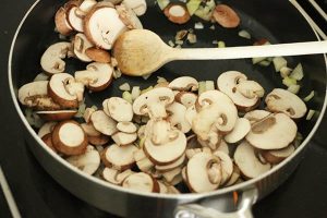 4. Snijd de champignons in plakjes en voeg ze toe en bak een paar minuten mee tot ze iets geslonken zijn.