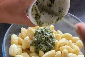 2. Doe de (ongekookte) gnocchi in een kom en roer de pesto erdoor.