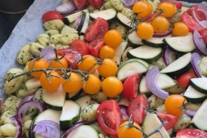 5. Snijd de courgette in halve plakjes en verdeel ook over de bakplaat samen met partjes tomaat en dungesneden rode ui. Meng door elkaar.