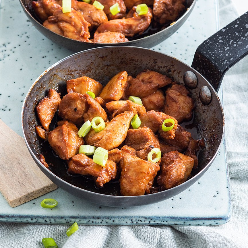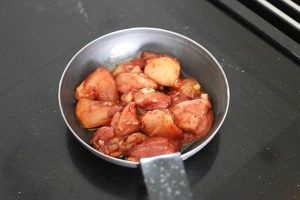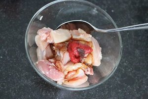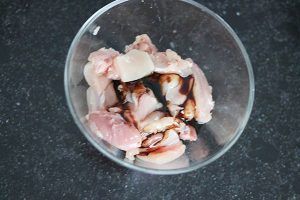 1. Snijd de kip in kleine stukjes en doe in een kom.