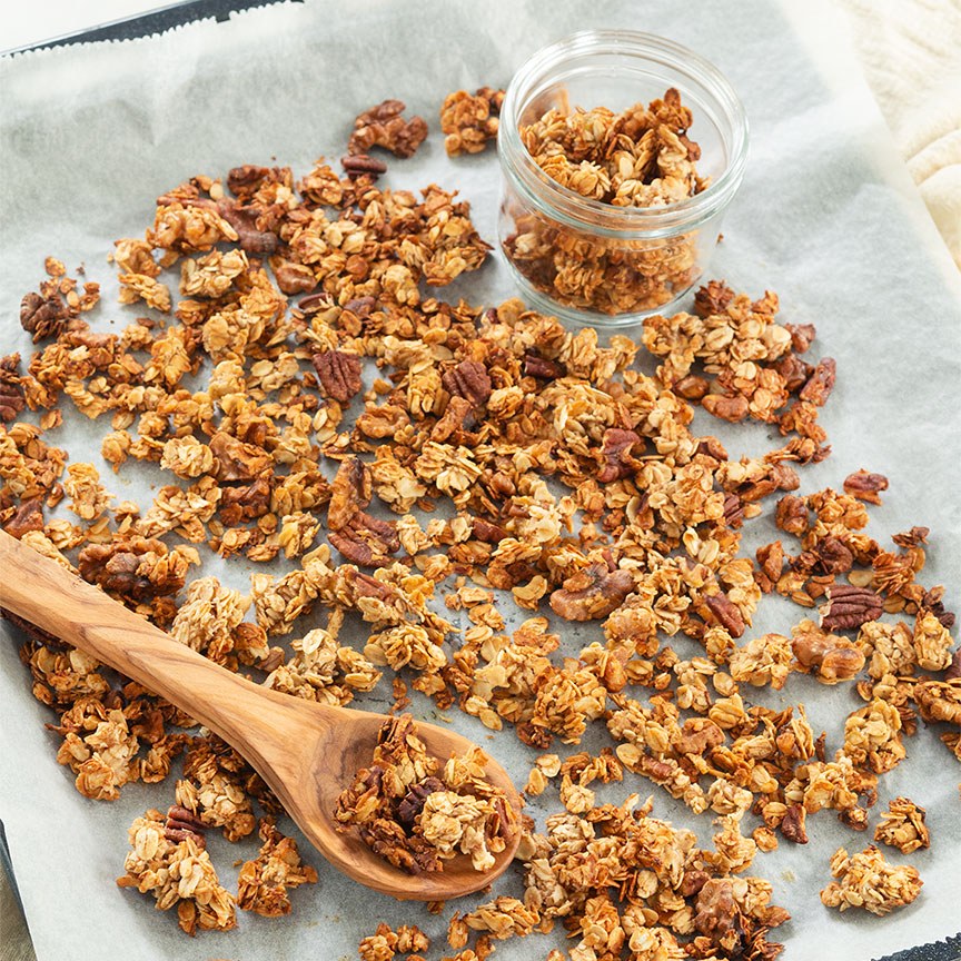 7. Deze granola is heerlijk als ontbijt met yoghurt of melk, of als knapperig tussendoortje.