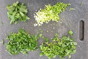3. Hak alle verse kruiden grof. De keukenmachine doet dadelijk de rest van het werk. Van de basilicum en de peterselie kun je de steeltjes ook gebruiken.