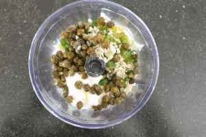 7. Voeg alle ingrediënten behalve de olijfolie toe aan de keukenmachine en maal alles goed door elkaar.