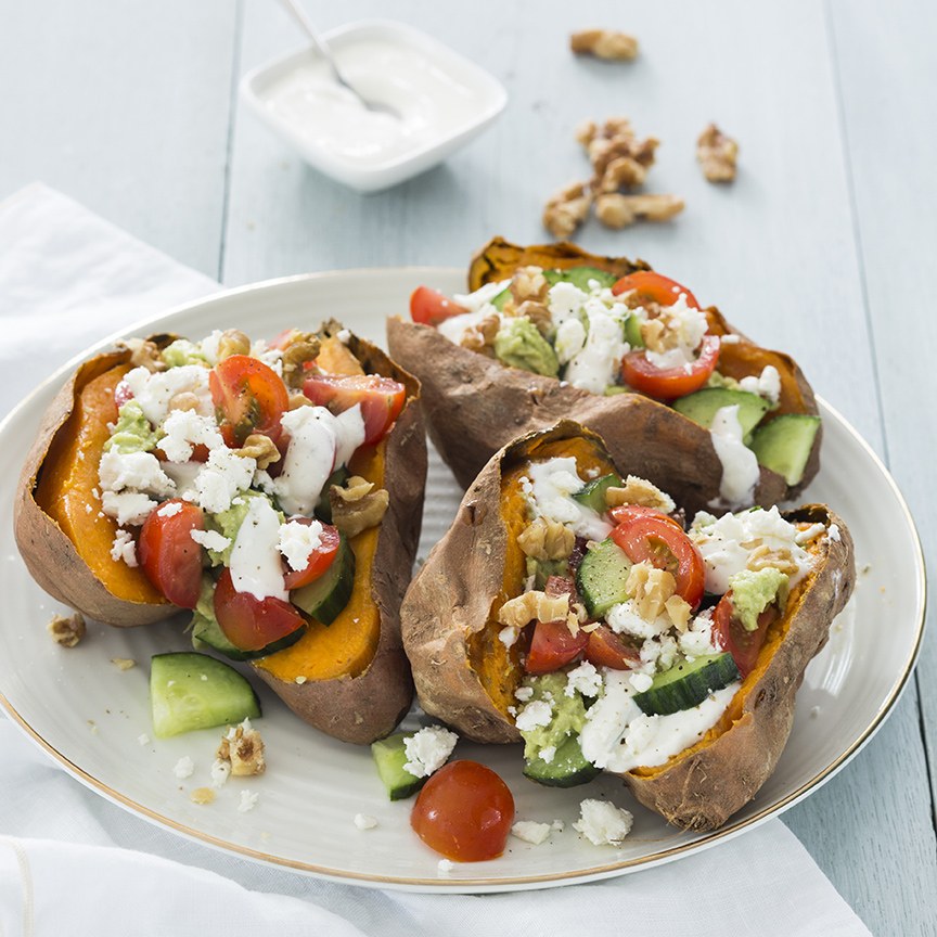 2. Snijd de tomaatjes in vieren en de komkommer in stukjes. Pureer het vruchtvlees van de avocado met een vork fijn. Haal de zoete aardappels uit de folie en snijd ze net niet doormidden. Vul ze met wat van het avocadomengsel, tomaatjes, komkommer en bestrooi met wat feta en walnoten. Serveer met de yoghurtsaus.