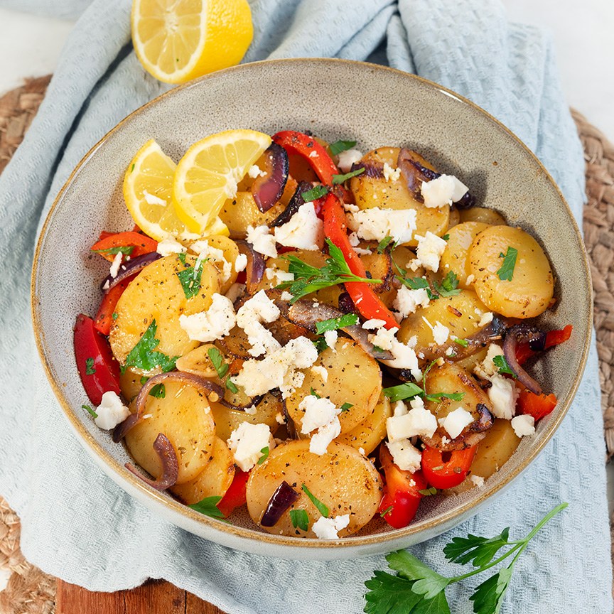 5. Serveer de Griekse aardappels met wat verse peterselie en wat partjes citroen. Die kun je er eventueel nog een beetje overheen druppelen. Kruimel als laatste de feta er overheen.