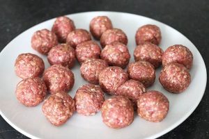 2. Draai er kleine balletjes van. Verhit een beetje olie of boter in een koekenpan en bak de gehaktballetjes eerst een paar minuten op hoog vuur rondom bruin en daarna nog 10 minuten op laag vuur tot ze gaar zijn.