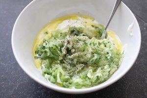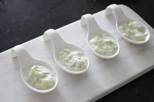 3. Rasp ondertussen de komkommer en meng met de yoghurt, een scheutje olie en pers de teen knoflook er bij. Zet dit zolang in de koelkast. Verdeel de tzatziki saus over kleine amuseschaaltjes of lepels.