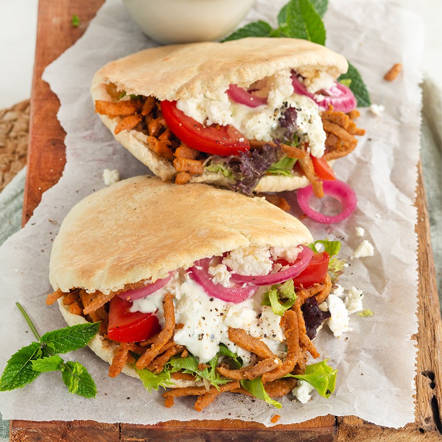 3. Vul de pitabroodjes met wat sla en tomaat. Schep hier wat gyros bij en maak de broodjes af met rode ui, stukjes feta en tzatziki saus.
