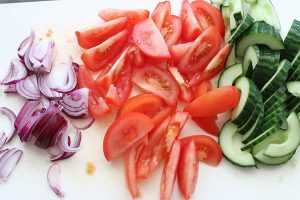2. Snijd de komkommer door de lengte doormidden, verwijder met een lepeltje het waterige gedeelte en snijd vervolgens in plakjes. Snijd de tomaten in partjes en de rode ui in dunne ringetjes.