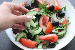 3. Meng de sla met de tomaten, rode ui en komkommer en voeg als laatste de helft van de dressing toe. Garneer de Griekse salade met olijven en feta en druppel er de laatste dressing overheen.
