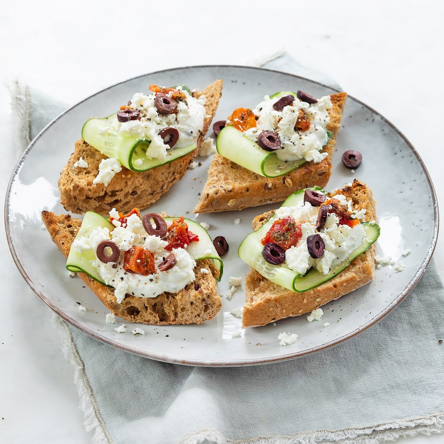 Beleg de broodjes met een schep tzatziki en een lint komkommer. Bestrooi met feta. Snijd de olijven en gedroogde tomaten in stukjes en verdeel hierover. Maak het af met een snuf zwarte peper.