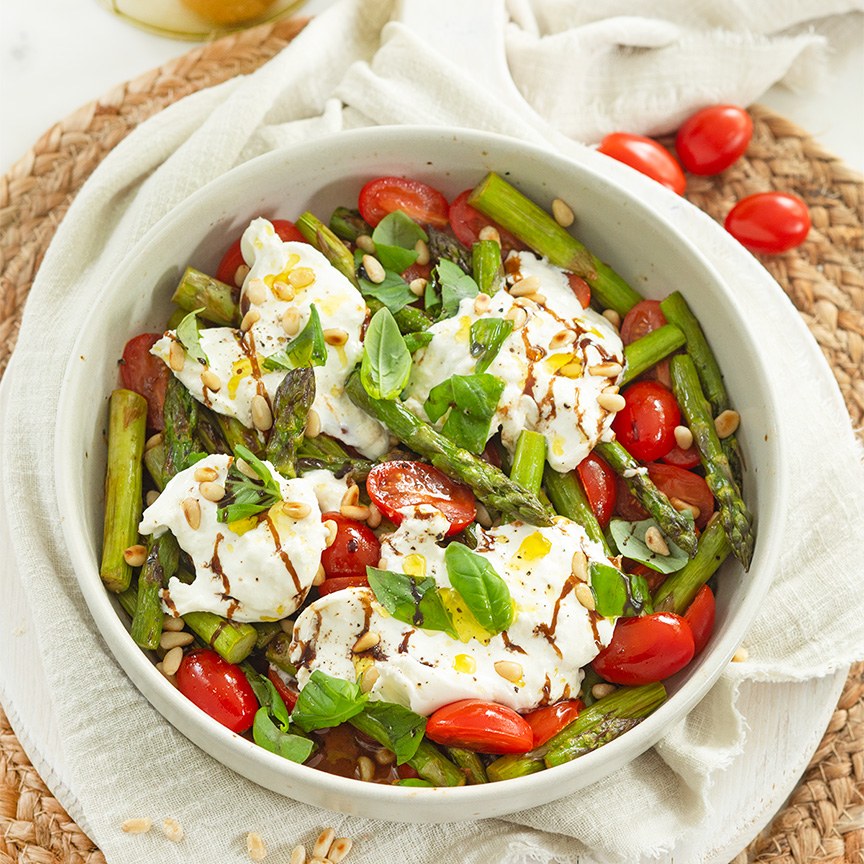 4. Doe de asperges en tomaatjes in een kom. Verdeel de dressing hierover. Breek of snijd de burrata in stukken en verdeel over de groenten.